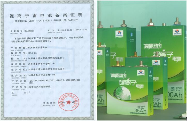 2013年11月春蘭清潔能源研究院有限公司LFL1-35功率型磷酸鐵鋰電池,獲得《安標國家礦用產(chǎn)品安全標志中心》頒發(fā)的鋰離子蓄電池備案證明。這是我司在已經(jīng)取得60Ah礦用備案證明后,第二個礦用電池備案證明,填補了礦用領域35Ah功率型磷酸鐵鋰電池的空白。