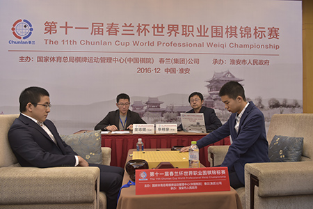 12月20日上午9:30,第十一屆“春蘭杯”八強(qiáng)賽(1/4決賽)在江蘇省淮安市開元名都大酒店蘭亭閣拉開帷幕,中、韓8名棋手參加了這場爭奪決賽權(quán)的大戰(zhàn)。 戰(zhàn)至下午,八強(qiáng)賽結(jié)束,其結(jié)果如下: 柯 潔(中國) 勝 羋昱廷(中國) 檀 嘯(中國) 勝 柁嘉熹(中國) 樸永訓(xùn)(韓國) 勝 連 笑(中國) 辜梓豪(中國) 勝 金志錫(韓國) 此輪大戰(zhàn),中國有3位棋手、韓國有1 位棋手進(jìn)入半決賽。 當(dāng)日下午4時,央視五套現(xiàn)場直播了中國圍棋協(xié)會副主席華以剛與中國職業(yè)圍棋選手陳盈講解的羋昱廷(中國)與柯潔(中國)的精彩對局。 與此同時,國家圍棋隊(duì)領(lǐng)隊(duì)華學(xué)明和國家圍棋隊(duì)總教練俞斌,在淮安市天元名都大酒店華龍廳為前來聽棋、觀棋的淮安市及其他地區(qū)的棋迷,掛盤講解了第十一屆“春蘭杯”八強(qiáng)賽(1/4決賽)辜梓豪(中國) 與 檀 嘯(中國)的精彩對局。 當(dāng)日17:30,八強(qiáng)賽(1/4決賽)獲勝的4名棋手,在淮安市天元名都大酒店群英廳進(jìn)行了四強(qiáng)賽(半決賽)抽簽,其對陣形勢如下: 柯潔九段(中國)VS樸永訓(xùn)九段(韓國) 辜梓豪四段(中國)VS 檀嘯七段(中國)