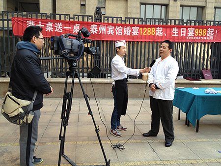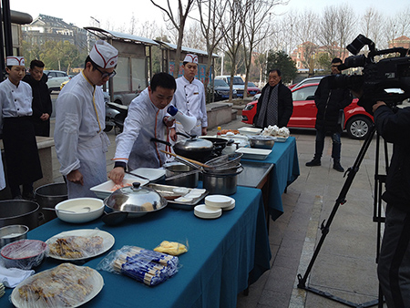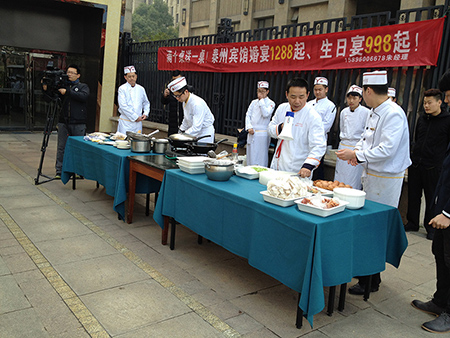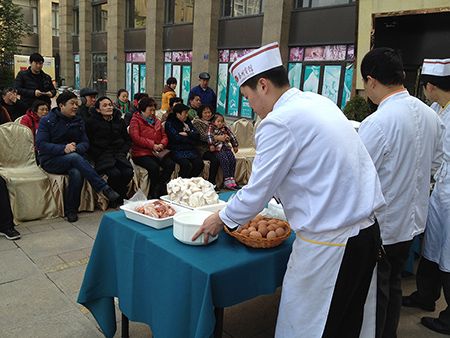 2月25日上午,春寒料峭,氣溫偏低。冒著初春早晨的寒風(fēng),泰州賓館五星大廚們早早地來到位于華辰尊園小區(qū)西側(cè)的廣場,將廚具、餐具、桌椅、食品原料一一排好,拉開陣勢。周邊社區(qū)的居民,以極高的熱情,陸續(xù)前來予以充分關(guān)注。