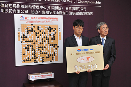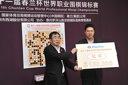 第十一屆“春蘭杯”決賽于2017年6月23日、25日和26日在廣東省惠州市羅浮山進(jìn)行了正式比賽。26日下午17:08,冠亞軍三番棋決勝局揭曉。至此,第十一屆“春蘭杯”決賽結(jié)果為:冠軍——檀嘯八段;亞軍——樸永訓(xùn)九段;季軍——柯潔九段;第四名——辜梓豪五段。比賽結(jié)束后,國(guó)家體育總局棋牌運(yùn)動(dòng)管理中心(中國(guó)棋院)與春蘭(集團(tuán))公司聯(lián)合舉行了隆重的頒獎(jiǎng)儀式,春蘭(集團(tuán))公司高級(jí)副總裁徐群、中國(guó)圍棋協(xié)會(huì)副主席華以剛、聶衛(wèi)平,向獲得第十一屆“春蘭杯”冠、亞軍頒發(fā)了獎(jiǎng)杯和獎(jiǎng)金。 “春蘭杯”總獎(jiǎng)金為40萬美元。其中,冠軍獎(jiǎng)金15萬美元,亞軍獎(jiǎng)金5萬美元。