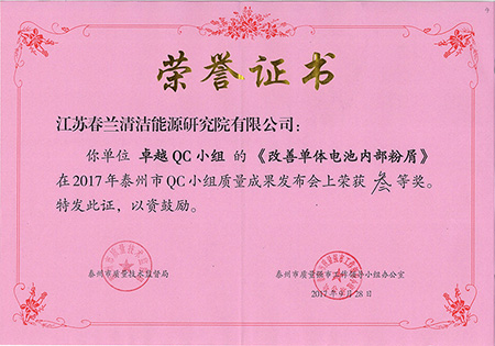 近日,江蘇春蘭清潔能源研究院有限公司“卓越QC小組”的《改善單體電池內(nèi)部粉屑》成果參加了泰州市技術(shù)監(jiān)督局組織的評審活動,并入選了QC小組發(fā)布會,發(fā)布會上,我司QC小組代表以飽滿的熱情進(jìn)行了深入淺出的講解,用生動的語言、詳實(shí)的資料、精美的圖片,運(yùn)用多媒體投影幻燈的形式將改善成果進(jìn)行了精彩的展示,得到評委的一致好評,最終榮獲泰州市三等獎的好成績。