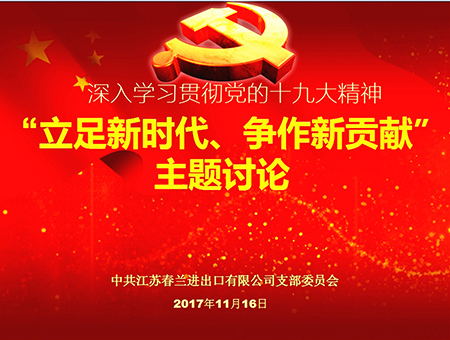 “將習(xí)近平新時代中國特色社會主義思想寫入黨章,是我黨指導(dǎo)思想的一次重大‘與時俱進(jìn)’,是十九大黨章最主要、最重大的歷史貢獻(xiàn)。它不僅表達(dá)了全黨的理論基礎(chǔ)和政治主張,也體現(xiàn)了全黨的意志和共同理想,既反映了黨的先進(jìn)性和時代性,也體現(xiàn)了新時代發(fā)展要求。作為一名黨員干部,我要認(rèn)真學(xué)習(xí)新黨章,不忘初心,牢記企業(yè)發(fā)展使命,把十九大精神中的新思想、新要求、新任務(wù)貫穿到實際工作的各個方面及各個環(huán)節(jié),團(tuán)結(jié)和帶領(lǐng)廣大職工為完成公司年度經(jīng)營目標(biāo)而奮斗……” 11月16日下午,江蘇春蘭進(jìn)出口有限公司(以下簡稱公司)黨支部召開專題組織生活會,認(rèn)真學(xué)習(xí)貫徹黨的十九大精神,并圍繞“立足新時代、爭作新貢獻(xiàn)”主題展開討論,參會黨員結(jié)合本職工作逐一發(fā)言、交流學(xué)習(xí)體會,黨支部書記周曉華對每個黨員的發(fā)言進(jìn)行了點評。 專題討論前,公司總經(jīng)理高元甲傳達(dá)了泰州市委組織部和春蘭集團(tuán)黨委《關(guān)于深入學(xué)習(xí)貫徹黨的十九大精神的通知》;周曉華宣講了十九大報告、新修訂黨章中的相關(guān)內(nèi)容,以及春蘭集團(tuán)黨委《關(guān)于學(xué)習(xí)宣傳貫徹黨的十九大精神的意見》。