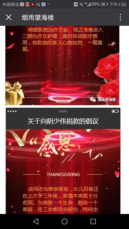 2017年8月,春蘭股份公司原后方車間陰少偉同志由醫(yī)院診斷為胃癌并隨后進行了手術治療,公司工會及時進行了看望和慰問。但在近期,面對各項醫(yī)療費用,以及正準備進入的二期化療及護理,陰少偉和他的家人心急如焚、一籌莫展。因為他的女兒目前正在上大學三年級,加之單親家庭,家境本來就較為拮據(jù)。 一方有難,八方支援。為挽救一個生命,救助一個家庭,春蘭股份公司、春蘭電子商務公司領導召開相關會議,由工會向全體干部職工發(fā)出了“愛心捐款倡議書”,并精心制作了微信動態(tài)圖文,通過公司微信群向相關人員發(fā)出倡議。