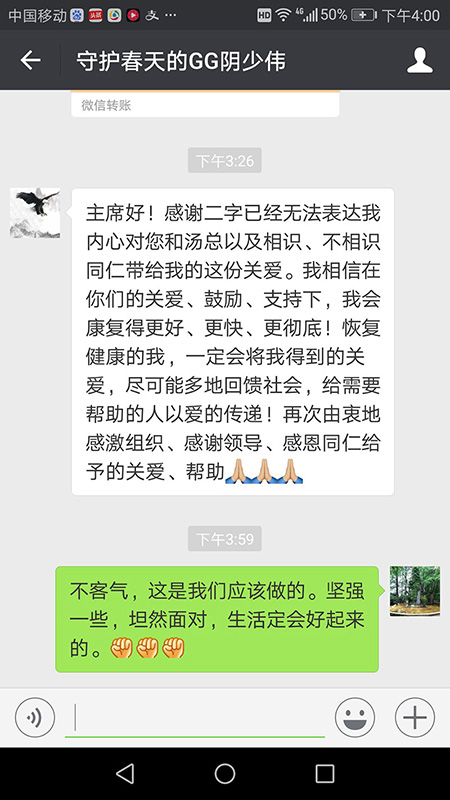 活動很快得到干部職工的積極響應,大家紛紛伸出援助之手,積極參加到這次“愛心捐款”活動中來!安挥弥x,一份愛心”、“不客氣,一點心意”、“幫助別人等于幫助自己,都是在為自己做事,是應該的”、“不管我們相識不相識,但愛心讓我們連在了一起”、“涓涓細流,匯聚在一起,這是愛的暖流,不僅會溫暖受捐人,也會感動你我,激勵他人,愛心一路向前”……微信互動,真情流露,點點愛心,匯聚成河,無私助人,溫暖真情。短短時間內(nèi),公司領導率先垂范,帶頭捐款,黨員群眾踴躍參與;甚至一些春蘭銷售、服務單位的人員聽聞此事后,也慷慨解囊積極捐獻;很多人與陰少偉素不相識,知曉此事,也第一時間自發(fā)積極參與到本次捐款活動中來。經(jīng)過短短幾天,募集愛心捐款就近萬元。