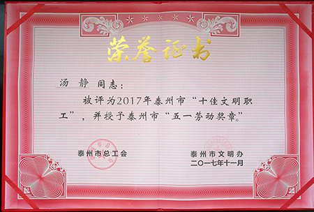 日前,泰州市總工會(huì)、泰州市文明辦共同命名表彰了2017年“泰州市文明職工、文明班組”和“泰州市十佳文明職工”。