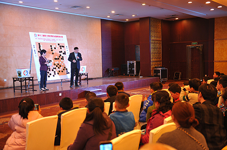 23日下午3時30分,國家圍棋隊領隊華學明與國家圍棋隊總教練俞斌,在泰州賓館百花園為前來聽棋、觀棋的泰州市及其他地區(qū)的棋迷,掛盤講解了第十二屆“春蘭杯”第一階段16強戰(zhàn)柯潔(中國)與姜東潤(韓國)的精彩對局。同日下午4時,在春蘭國賓館內,中央電視臺體育頻道現場直播了原中國圍棋協會主席王汝南與美女職業(yè)棋手陳盈,也掛盤講解了柯潔與姜東潤的經典對局。