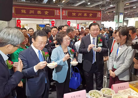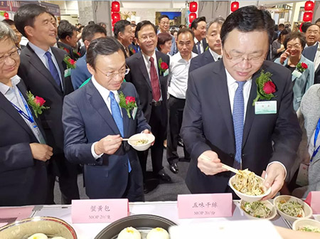 泰州干絲在眾多美食中脫穎而出,獲得全場青睞。在展示泰州賓館特色產(chǎn)品的展臺前,江蘇省委常委、統(tǒng)戰(zhàn)部部長楊岳,全國政協(xié)委員、澳門江蘇聯(lián)誼會名譽會長賀定一女士,澳門特區(qū)政府社會文化司司長譚俊榮等領導品嘗了嫩滑爽口的賓館干絲。賓館干絲的美味讓領導嘉賓們大飽口福,紛紛豎起大拇指點贊。
